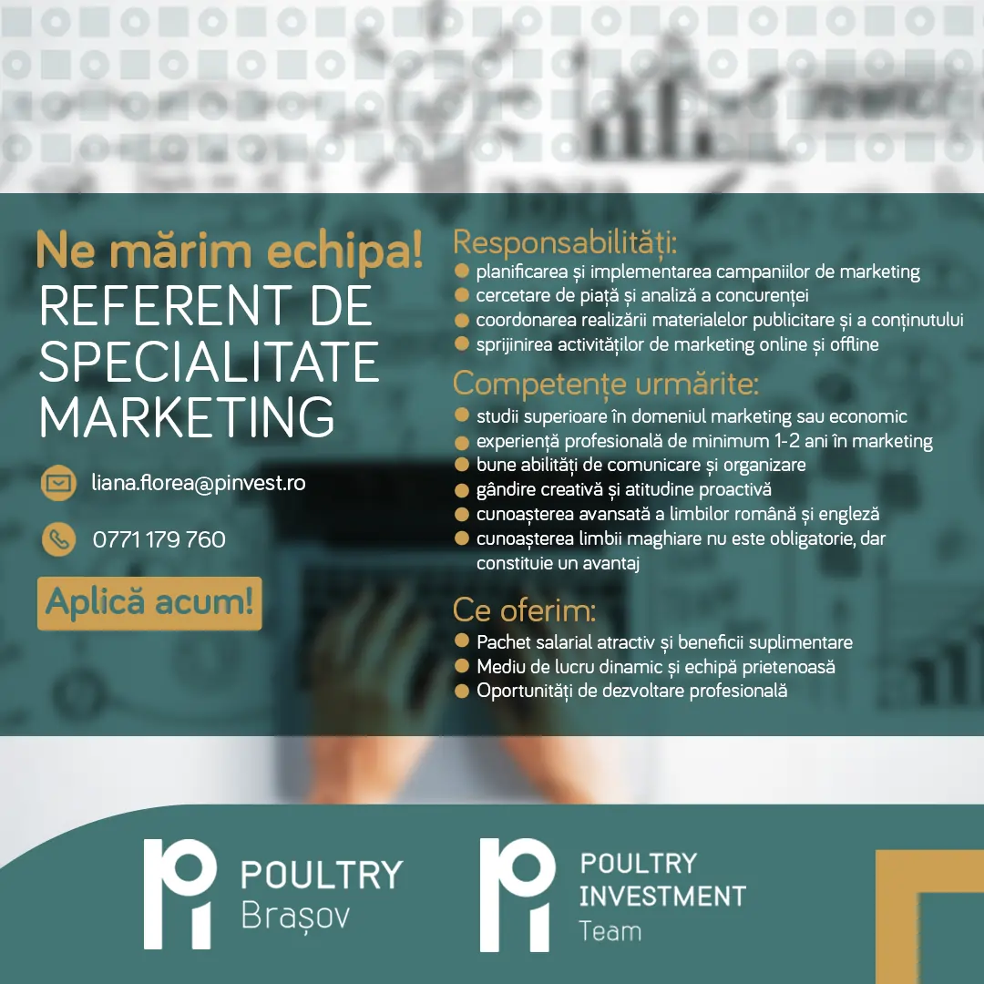 Așteptăm CV-urile voastre la adresa de email: liana.florea@pinvest.ro, sau la nr. de tel.: 0771-179.760 pe WhatsApp.