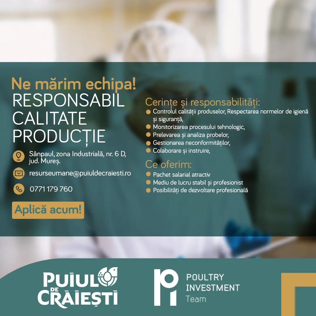 Dacă te potrivești profilului și vrei să faci parte din echipa noastră, trimite-ne CV-ul tău la adresa de email: resurseumane@puiuldecraiesti.ro, sau la nr. de tel.:0771-179.760 pe WhatsApp.