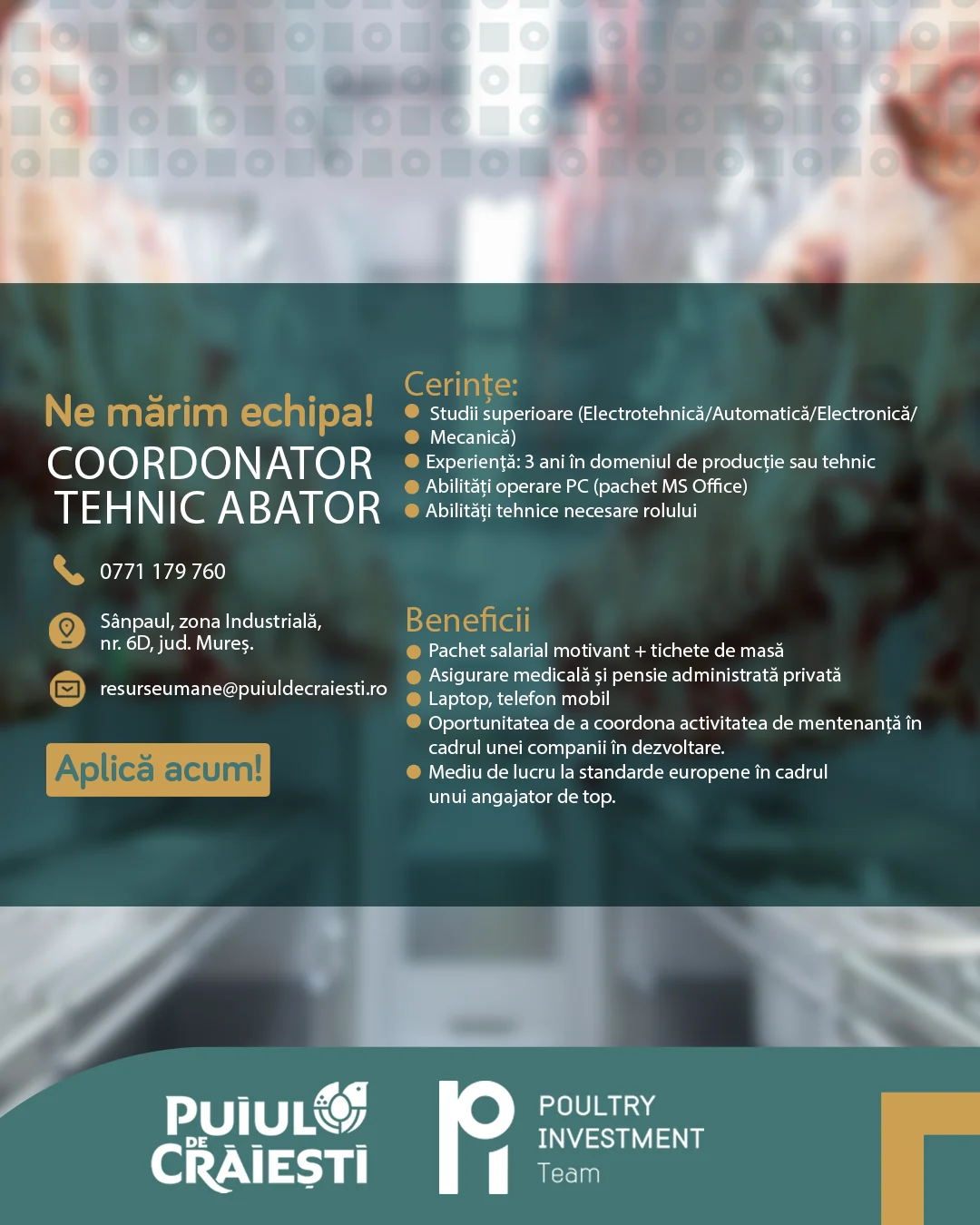 Dacă îndeplinești aceste cerințe atunci poți aplica pentru postul vacant de Coordonator Departament Mentenanță.